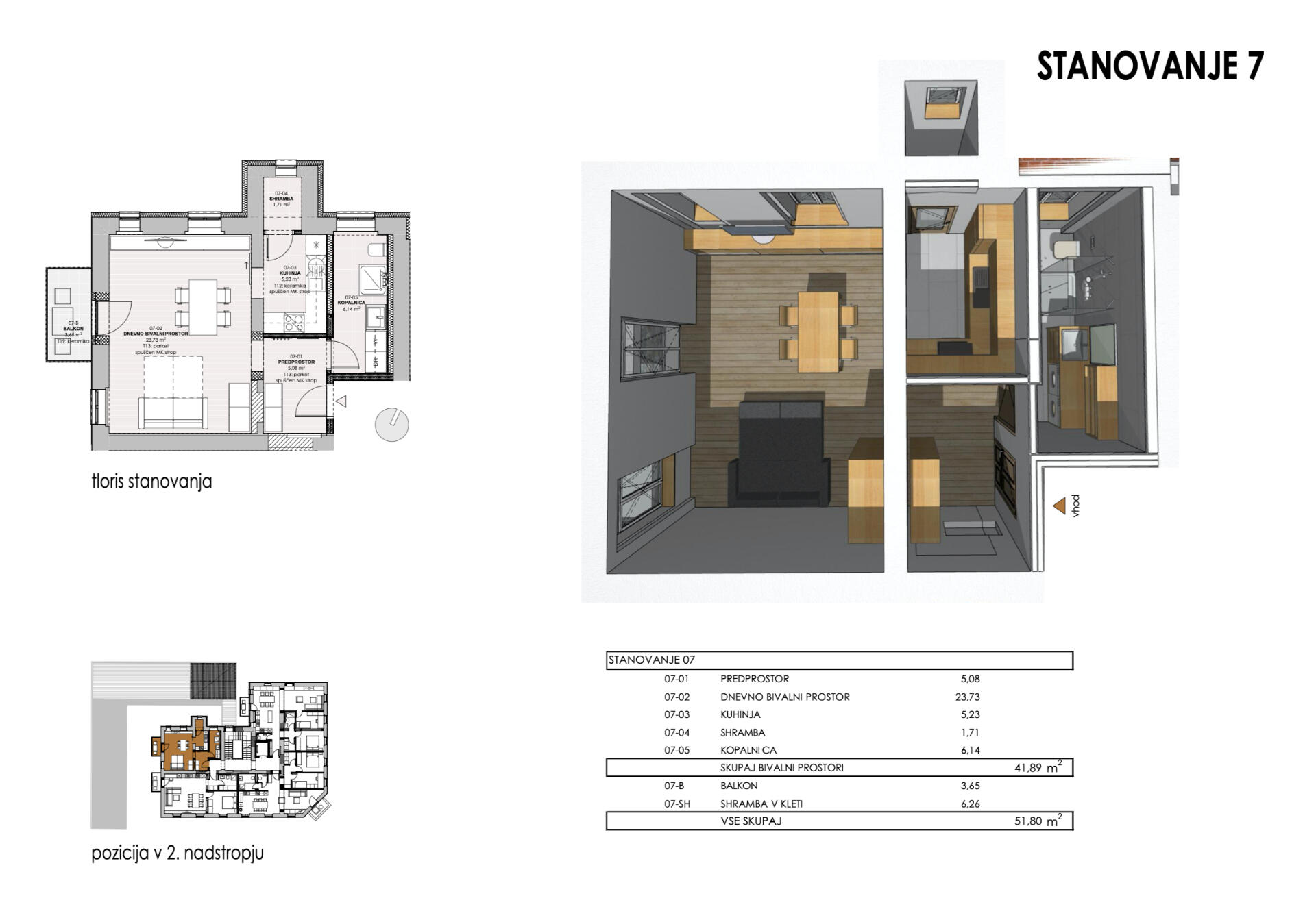 Stanovanje 7: nahaja se v 2. nadstropju objekta; privaten balkon; shramba v kleti; dostopno z dvigalom. Razporeditev s tlorisi → | 41,89 | 3,65 | 6,26 | |