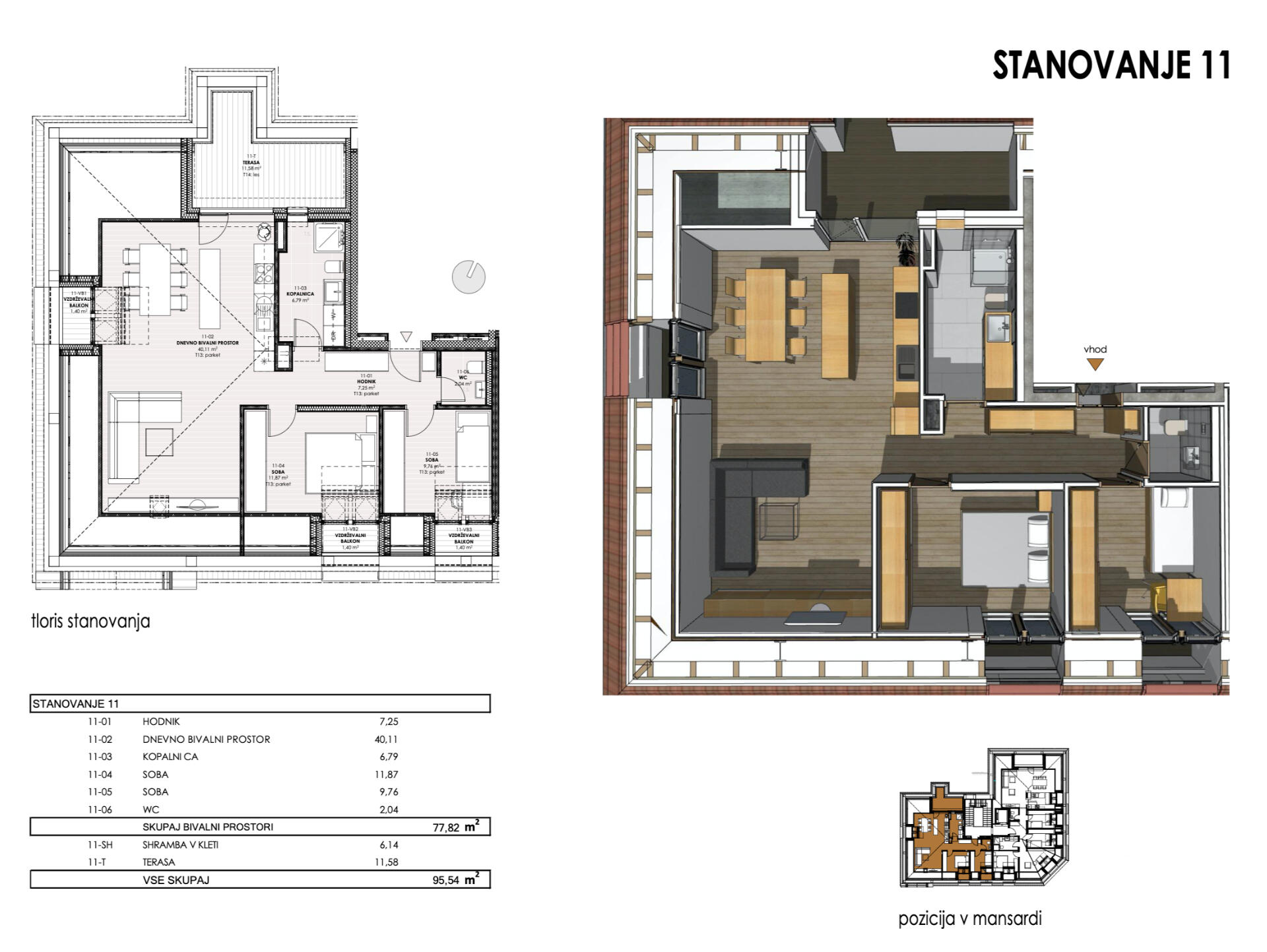 Stanovanje 11: nahaja se v 3. nadstropju objekta (mansardno stanovanje); 2 spalnici; velik dnevno bivalni prostor; velika privatna terasa; shramba v kleti; dostopno z dvigalom. Razporeditev s tlorisi → | 77,82 | 11,58 | 6,14 | |
