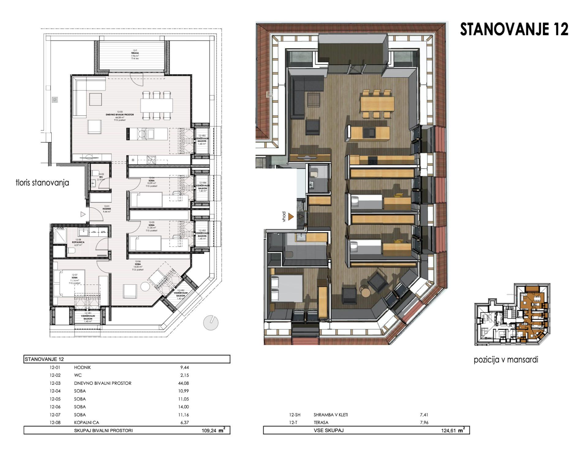 Stanovanje 12: nahaja se v 3. nadstropju objekta (mansardno stanovanje); 3 spalnice in 1 dodatna soba; ogromen dnevno bivalni prostor; velika privatna terasa; shramba v kleti; dostopno z dvigalom. Razporeditev s tlorisi → | 109,24 | 7,96 | 7,41 |